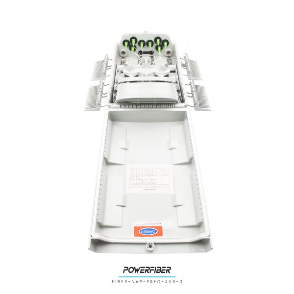 CAJA EXTERIOR FTTH PRECONECTORIZADA 4X8 CON SPLITTER 1X8 CONECTOR SC/APC CON SANGRIA CON CRUZ